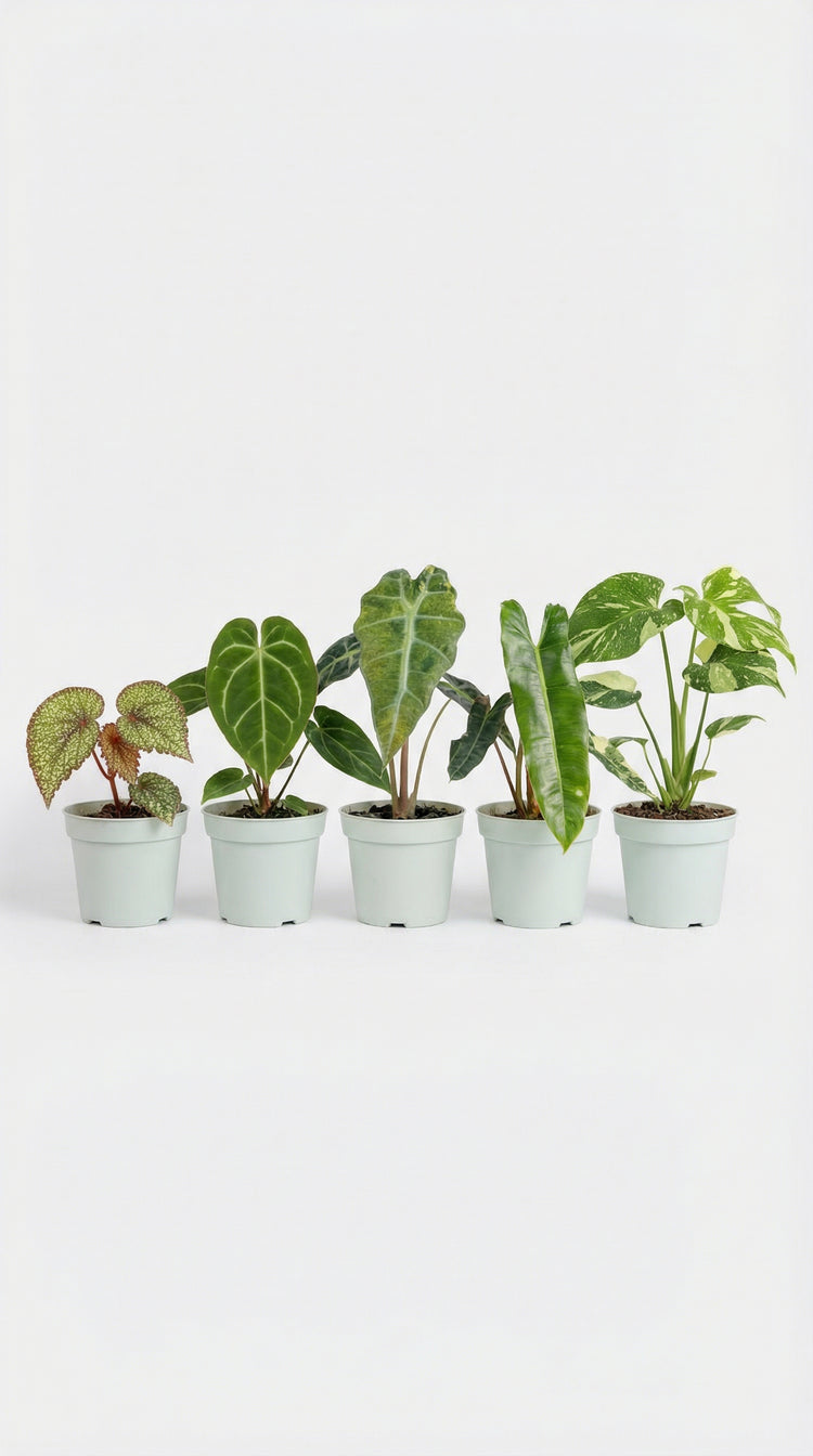 Bright indirect light is ideal for all plants in this bundle. Avoid direct sun which can damage sensitive leaves.
